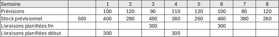 Le planning peut prendre la forme suivante, dans ce cas, la commande est passée au fournisseur sur la base du niveau de sécurité du stock prévisionnel et non du point de commande du stock réel.