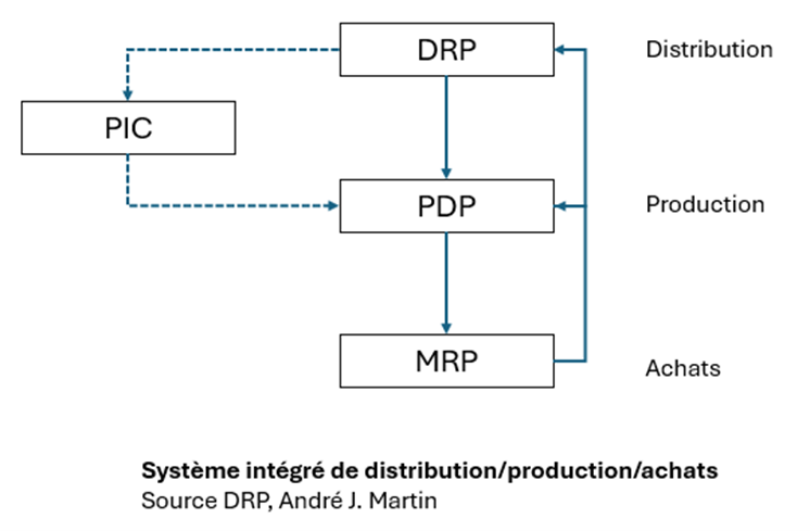 La Planification des Ressources de Distribution – DRP (Distribution Resource Planning) – consiste à intégrer les lieux de stockage au calcul des besoins nets, mais aussi de remonter les informations de consommations des produits depuis leur lieu de vente, de les agréger, de programmer dans le temps la distribution et les approvisionnements nécessaires. En cela, les calculs de DRP sont réalisés en amont du Plan Directeur de Production.