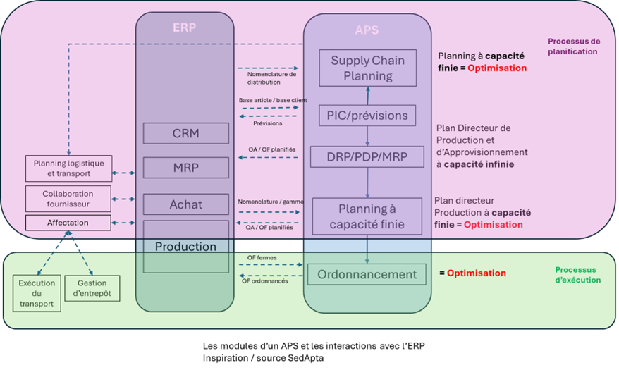 Le schéma montre que les APS interagissent avec les systèmes d’exécution comme les Manufacturing Execution System (MES), les systèmes d’e-procurement, les Warehouse Management Systems (WMS) ou les Transportation Management Systems (TMS) en proposant des ordres d’achat (OA), des ordres de fabrication (OF), des ordres de livraison ou des ordres de transport à ces systèmes.