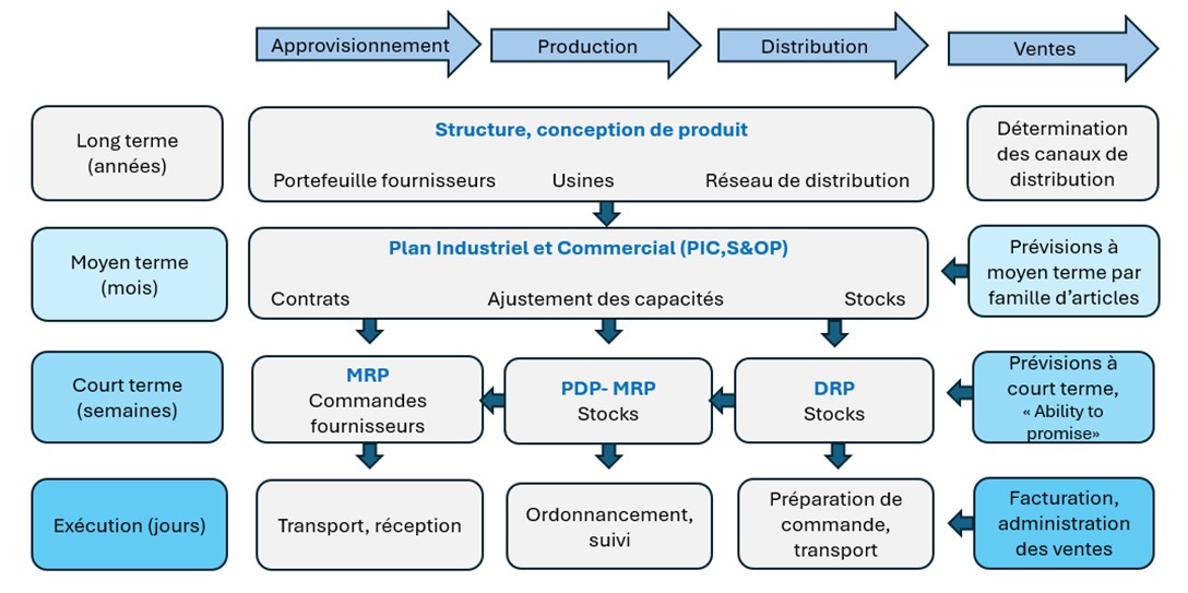 Tous les processus décrits précédemment s’intègrent entre eux : les calculs de DRP influent sur le PDP qui détermine les calculs MRP. Ils permettent d’établir le PIC et surtout selon le changement des hypothèses sur les besoins (prévisions…) et les ressources (disponibilités des machines, des fournisseurs…), les systèmes APS permettent de rejouer différents scénarios.